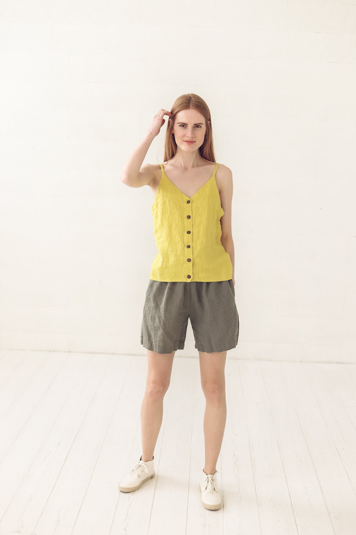 Kick off your summer adventure with this bright yellow linen button-front camisole. The V-neck design adds a touch of femininity, while the button-front placket perfectly blends classic and casual appeal. Crafted from breathable linen, it feels like a ray of sunshine, adding a touch of bright, fresh air to your wardrobe. Whether you’re soaking up the sun at the beach or strolling through a summer festival, this camisole makes it easy to look stylish and stylish.