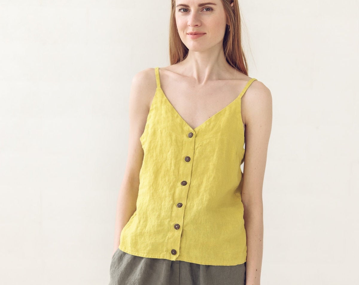 Beach Day Bliss: Pair this yellow camisole with high-waisted denim shorts and flip-flops. Add a wide-brimmed straw hat and a beach tote bag for a day filled with sun, sand, and surf. The linen fabric provides a cool, refreshing feel, while the vibrant color adds a pop of color to your beach look.