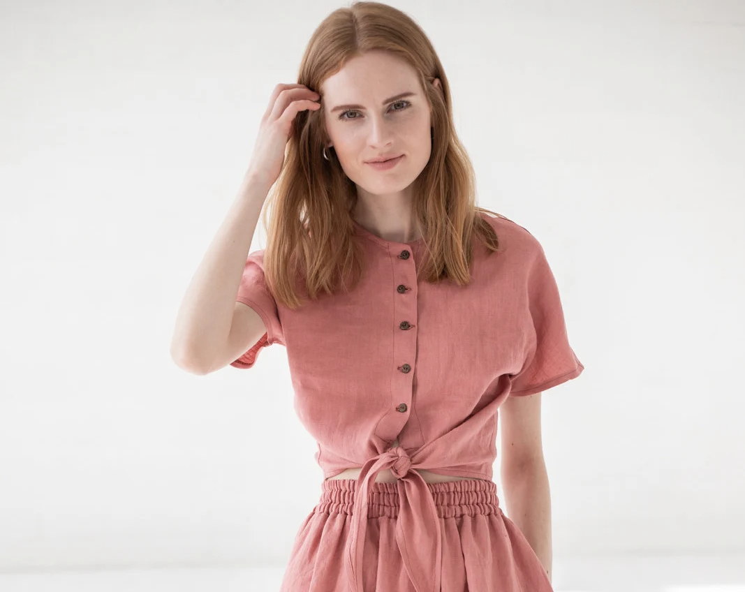 This top is a summer favorite with its versatile style and feminine details. The pure linen fabric ensures breathability, while the tie-down hem and button front allow for versatile styling. It’s perfect for women seeking a playful, easy-to-wear piece.