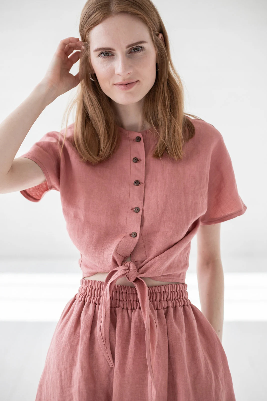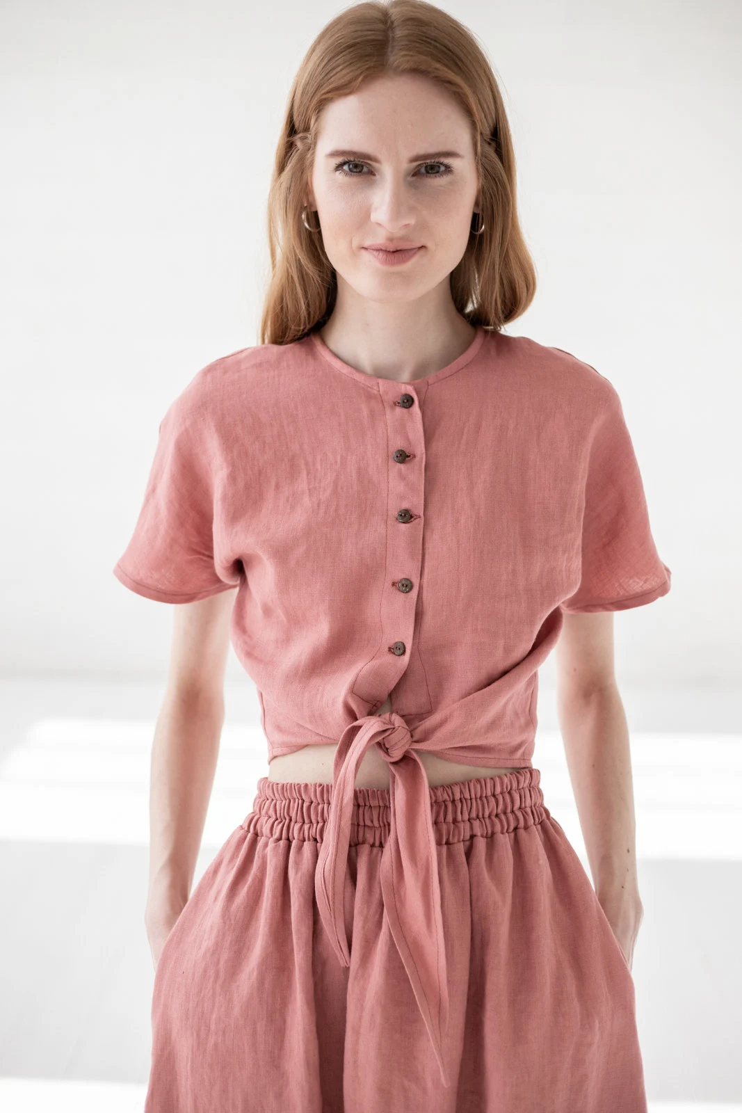 Elevate your wardrobe with this pink linen button-front tie-hem top! The cropped tie-hem silhouette combines playful charm with understated elegance. The short sleeves and round neck create a feminine, elegant look, while the button front and adjustable tie ties add versatility. Whether dressed casually or formally, it adds a touch of romance to summer.